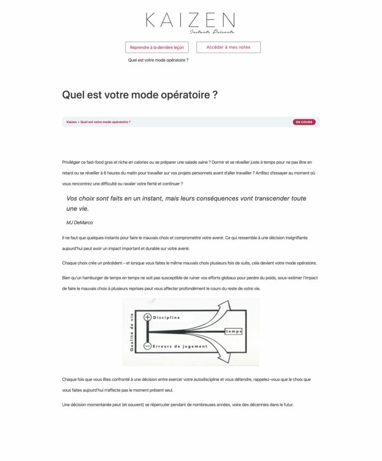 Une fois votre inscription validée, vous pourrez commencer à suivre le programme KAIZEN. De nouveaux modules sont débloqués en continue afin de vous permettre d’assimiler et surtout d’appliquer les idées et concepts que vous pourrez découvrir.